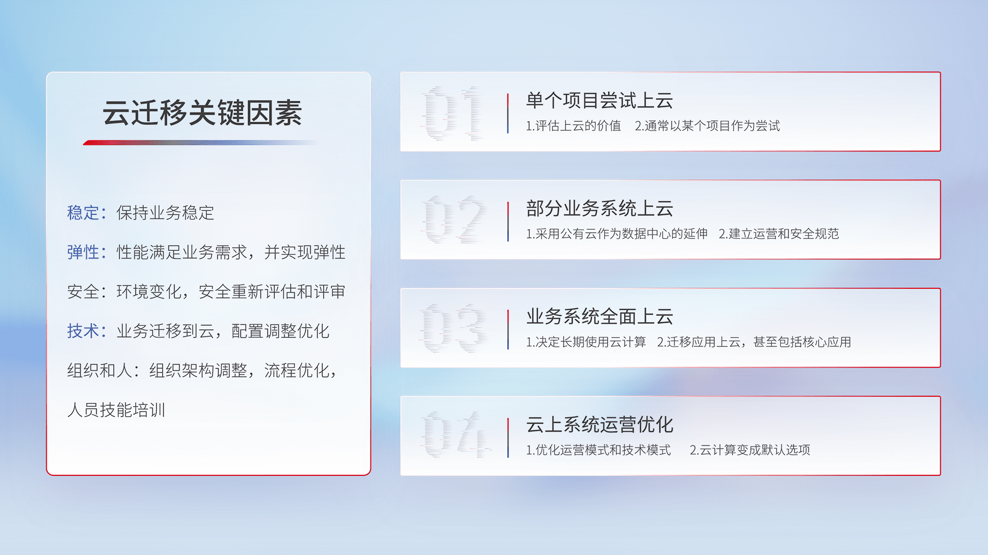 结合实际业务,,,从规划设计、、、、云平台选型、、、云原生改造、、数据迁移、、集成交付,,迁移全过程为客户识别最佳上云路径,,做好风险识别管理,,设计网络架构、、身份权限、、、安全审计合规、、、操作审计、、、日志审计、、、监控告警策略、、多站点容灾设计等,,对云上基础设施进行整体规划,,提升IT治理水平,,,以满足弹性、、、、高可用、、、高性能的需求。。。