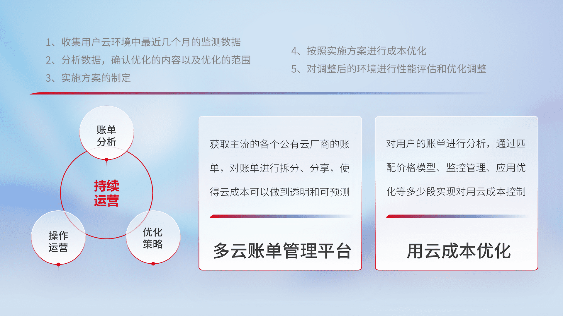 通过多云纳管,,,,以统一的资源数据模型把客户的云资源进行抽象和封装,,,进而实现对多云资源的统一操作,,,,保障云资源管理的可靠性、、稳定性与可用性。。。。量身定制化运维内容,,配置、、、开发运维、、、、补丁管理、、备份、、监控、、、、认证和访问管理、、、审计和日常巡检等,,,,保障在用云过程中的可靠度,,,稳定度以及高可用率。。。。