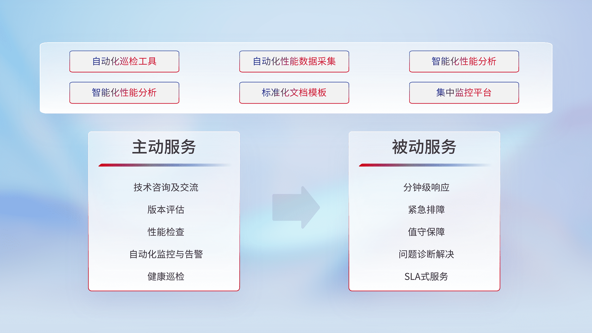 智能化工具和标准化文档,,保障服务质量,,提供主动服务(包含技术咨询、、、、版本评估、、性能检查、、自动化监控与告警、、、健康巡检)和被动服务包含(分钟级响应、、、、紧急排障、、、、值守保障、、、问题诊断解决、、、、SLA服务)。。