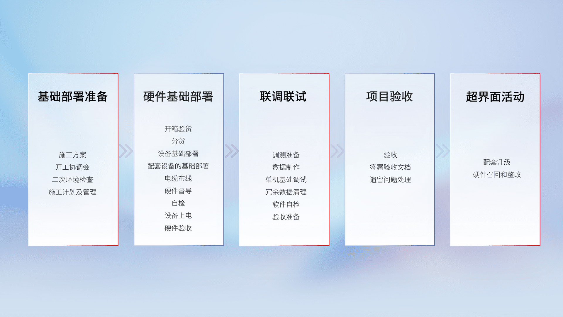 从基础部署准备、、硬件基础部署、、、、联调联试、、、、项目验收、、、越界面活动的全过程可追溯,,,保证施工质量和进度。。。